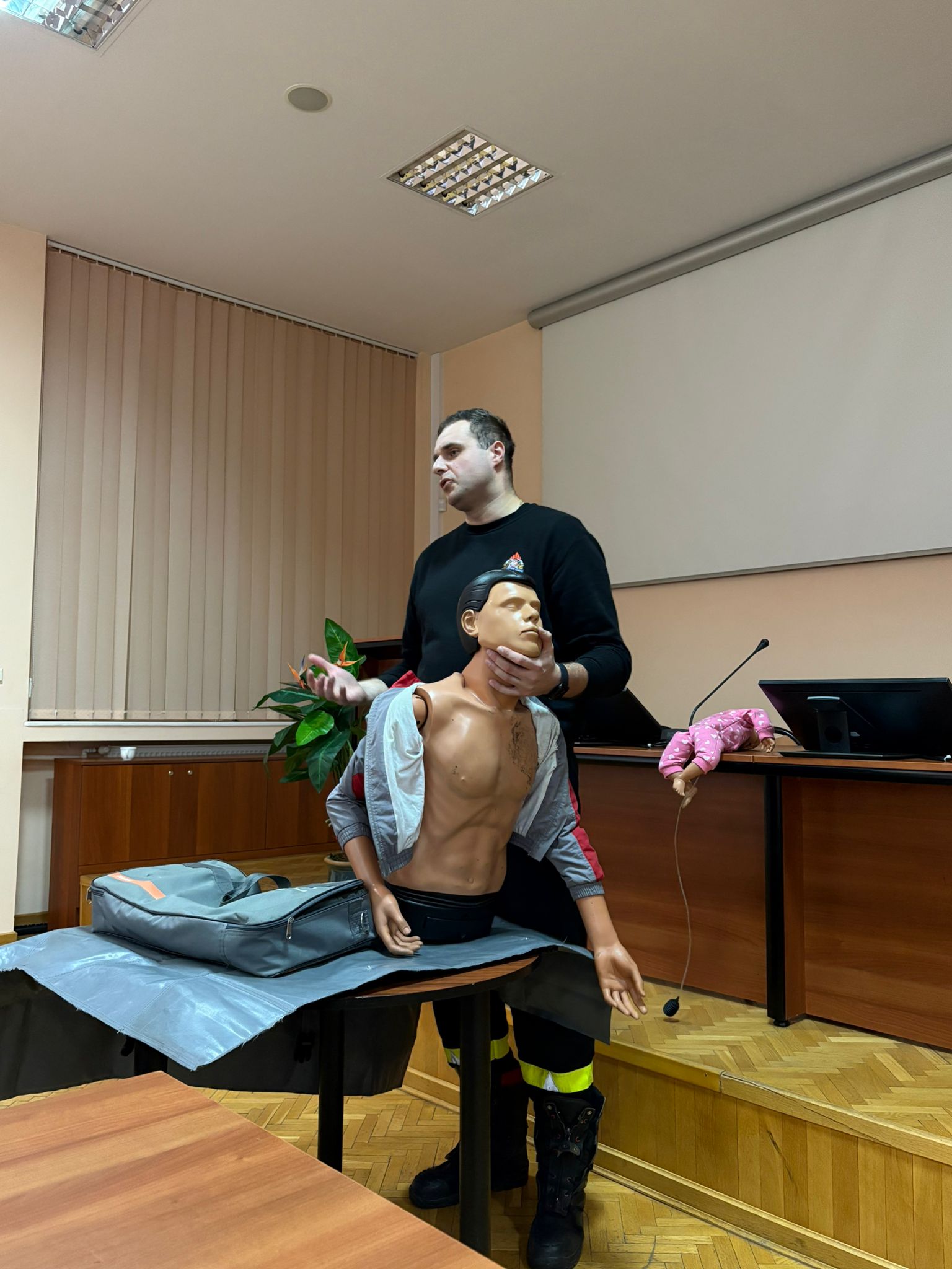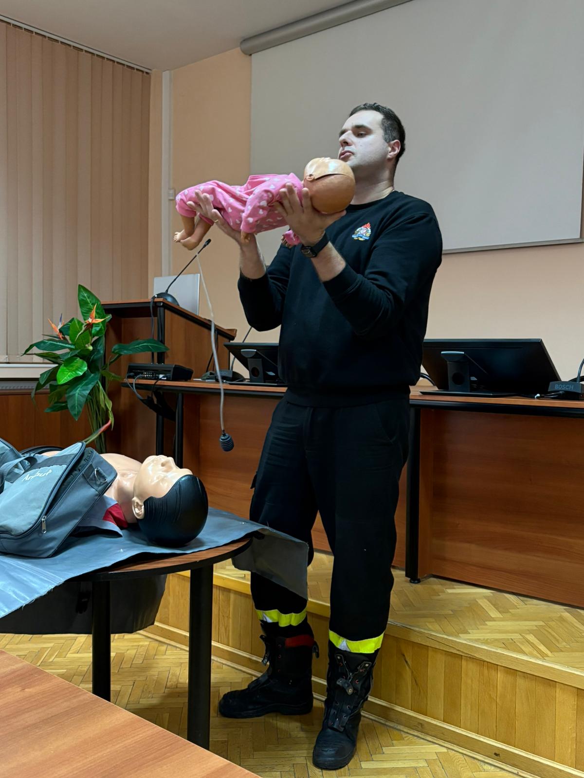 Kolejnym punktem szkolenia było wystąpienie Pana Piotra Kopczewskiego z Komendy Powiatowej Państwowej Straży Pożarnej w Wysokiem Mazowieckiem. Szkolenie „Pierwsza pomoc przedmedyczna w nagłych przypadkach” obejmowało omówienie procedur postępowania w sytuacjach zagrożenia życia oraz praktyczne wskazówki dotyczące udzielania pierwszej pomocy. Podczas zajęć zwrócono uwagę na najczęstsze przypadki wymagające reakcji oraz prawidłowe schematy działania. Uczestnicy mieli okazję utrwalić procedury, które mogą okazać się kluczowe podczas nagłych zdarzeń.