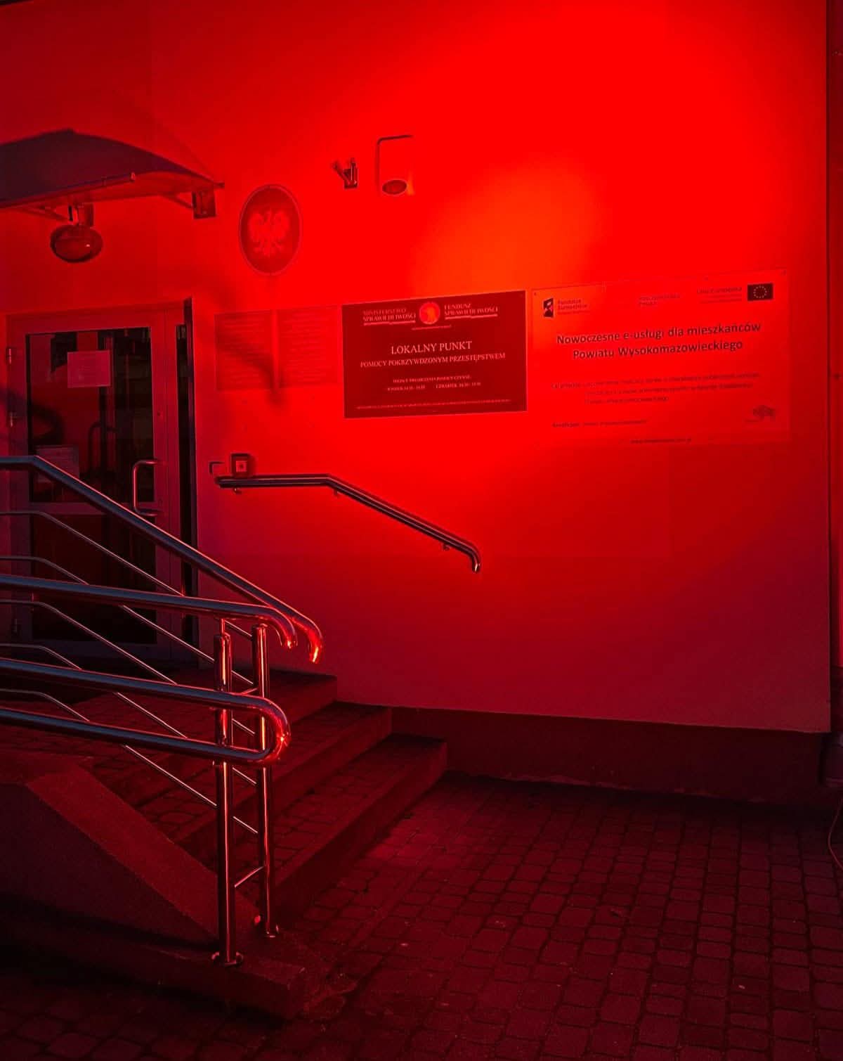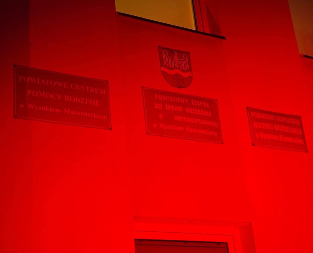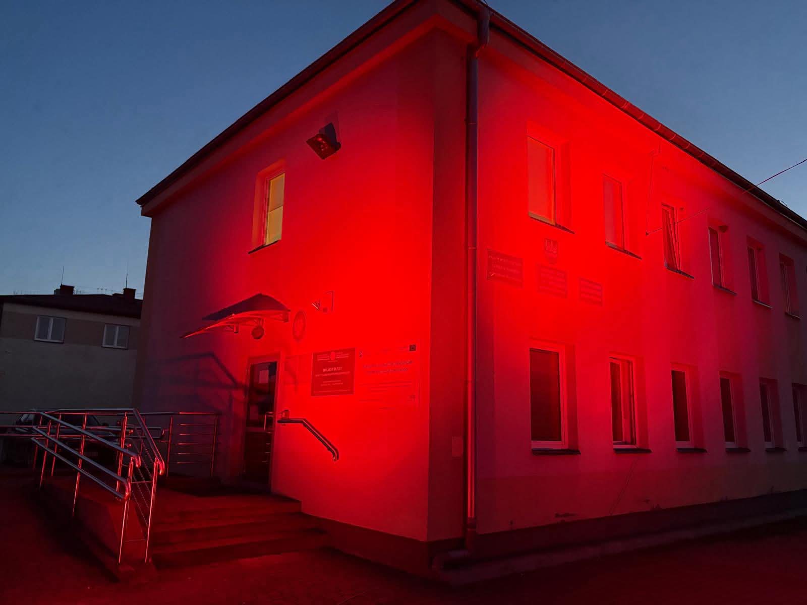 Wieczorem na czerwono został również podświetlony budynek PCPR, aby jeszcze mocniej zaakcentować nasze wsparcie dla kampanii i zwrócić uwagę społeczności na problem przemocy wobec dzieci.